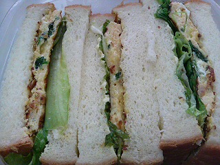 ほうれん草、チーズ、ソーセージ入りオムレツのサンドイッチ