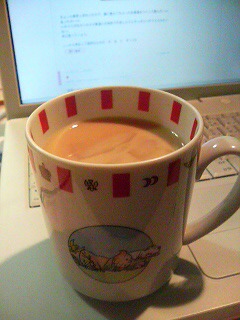 めんどくさいからティーバックで紅茶入れて、冷凍しておいた生姜のスライスをカップにぶちこみ、牛乳と蜂蜜を入れる。